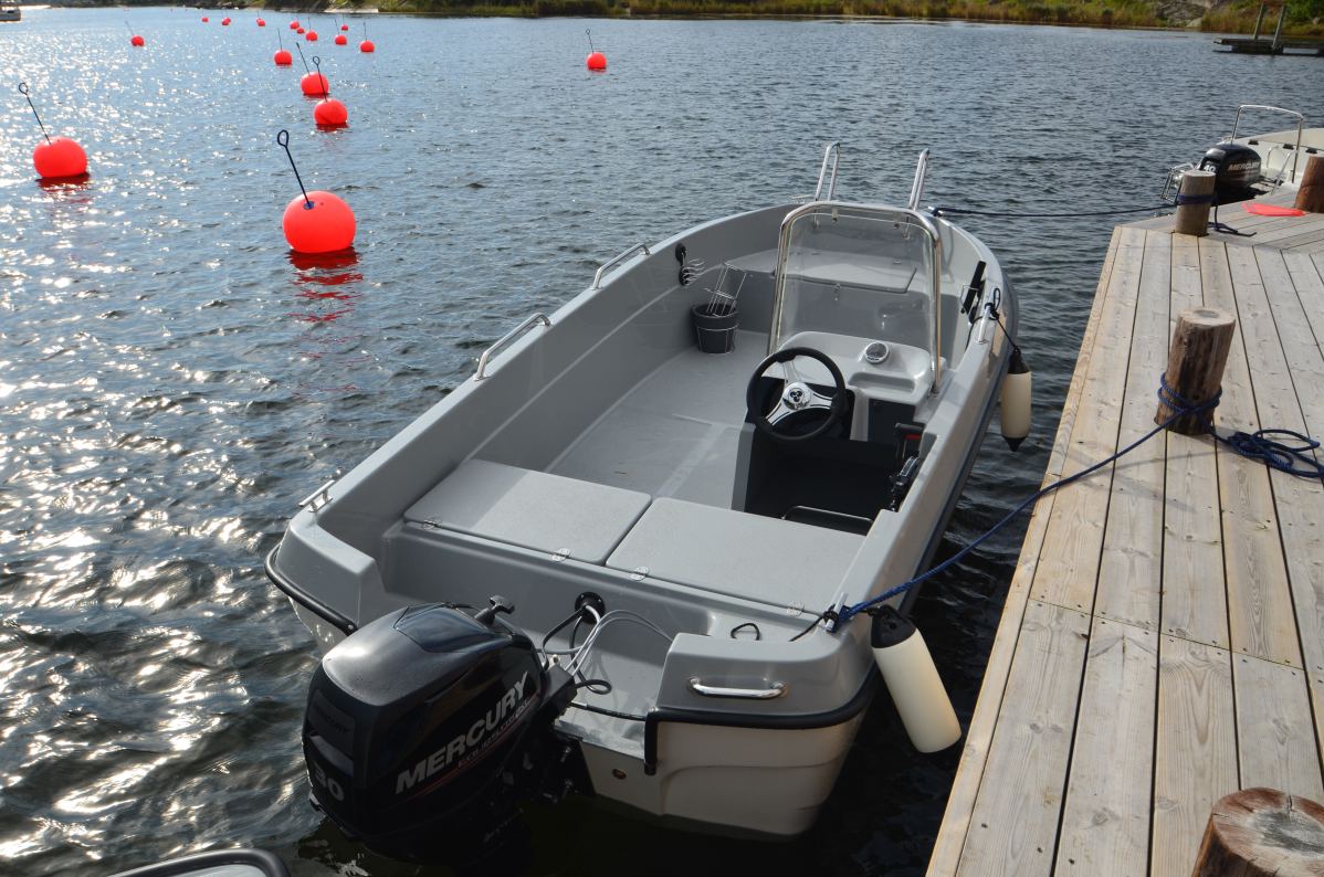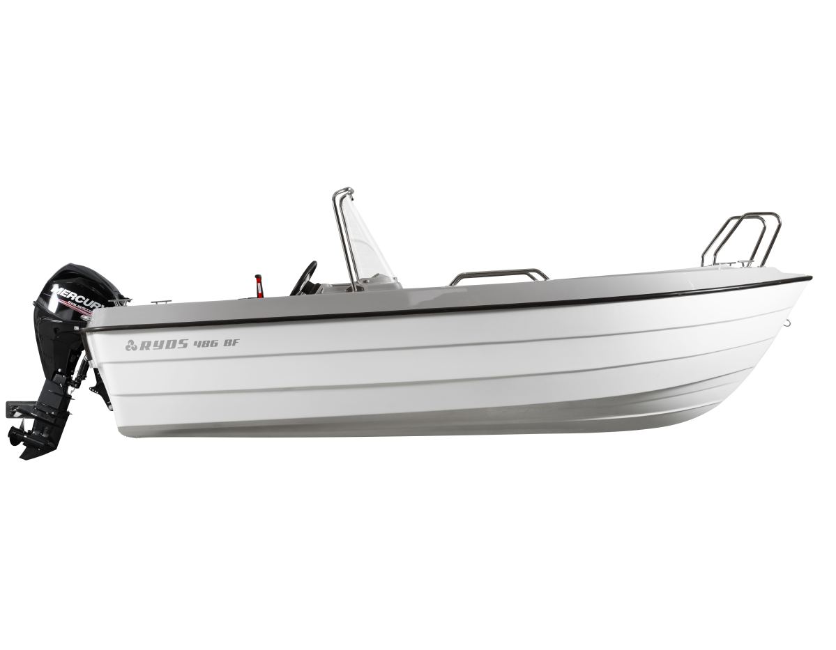 Med sit rummelige dæk er der plads til det meste, og er der folk med, kan du supplere med en eller to ekstra stuvekasser med siddepladser. Ryds 486 BF er en perfekt kystbåd med sit robuste og stabile skrog. 486 BF går omkring 25 knob med en 30 hk Mercury motor.