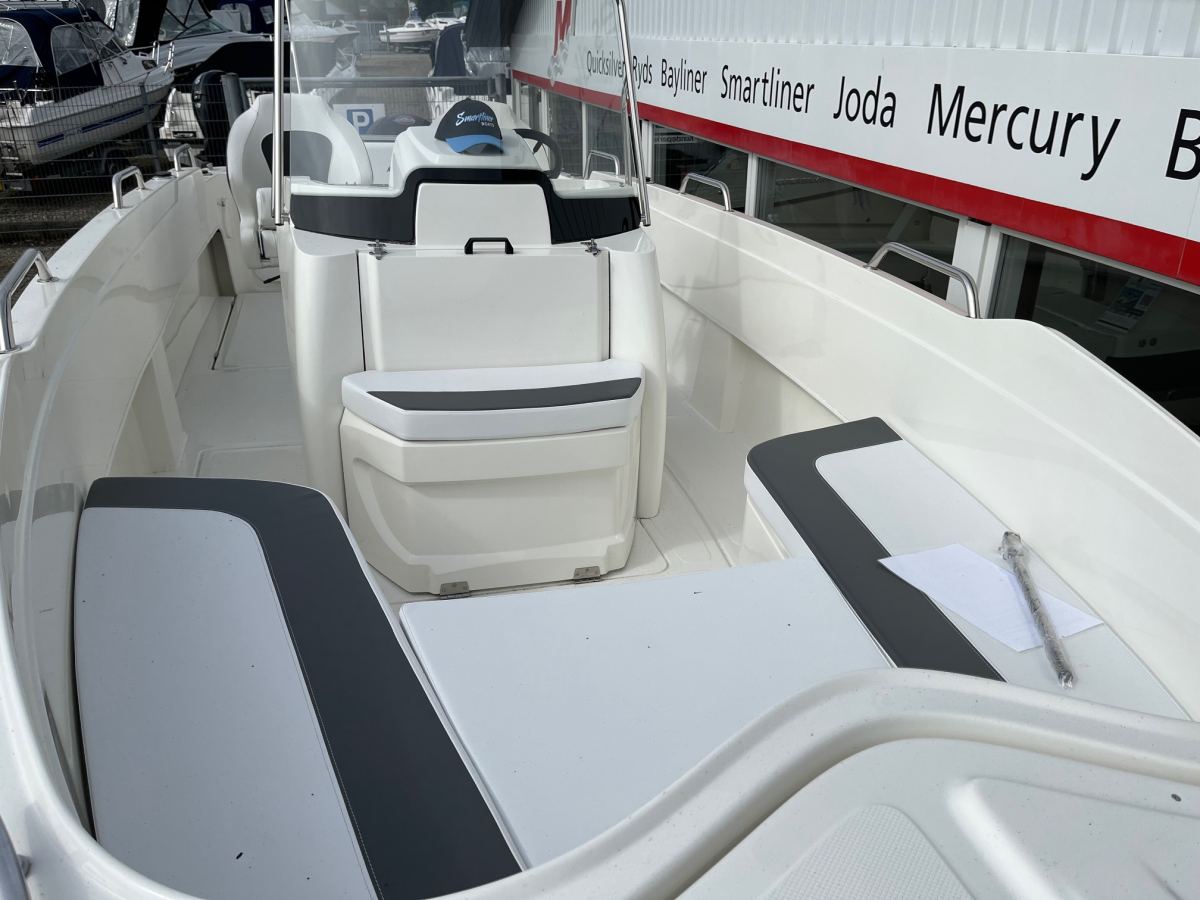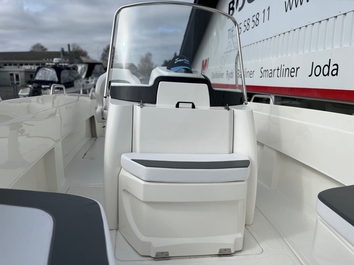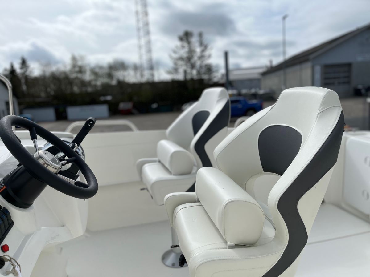 Båden emmer af skønhed. Her er tænkt på det hele: Godt med siddepladser og muligheder for tør opbevaringsplads, 4 stangholdere, lys i styrepulten og en god stor brændstoftank på 140L.