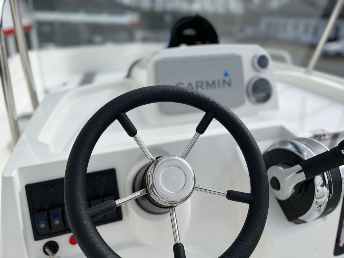 Her er der rigelig plads til at teste om fiskene bider bedre på den ene eller den anden side af båden. Styrepulten er centralt placeret med overdækning, så uagtet om det regner eller solen brænder er der altid mulighed for læ fra oven.