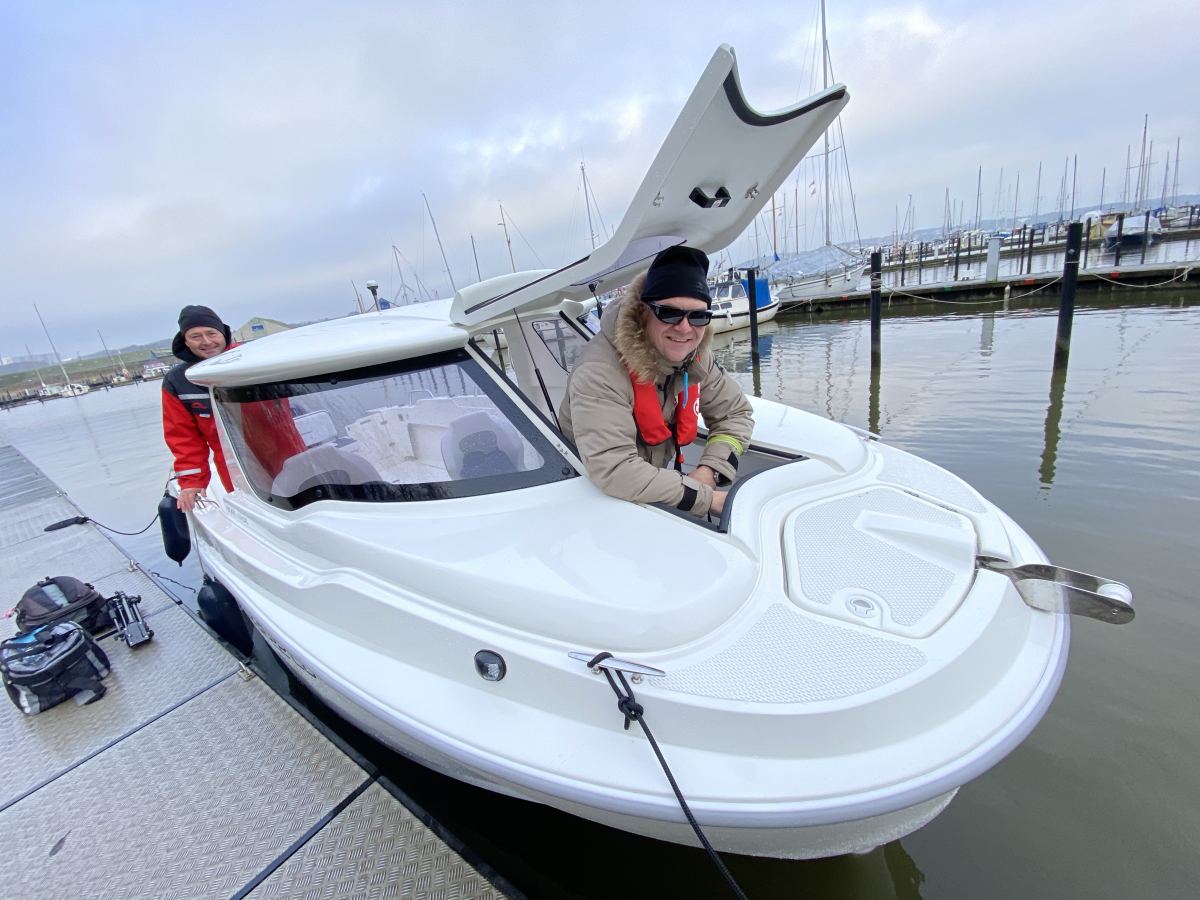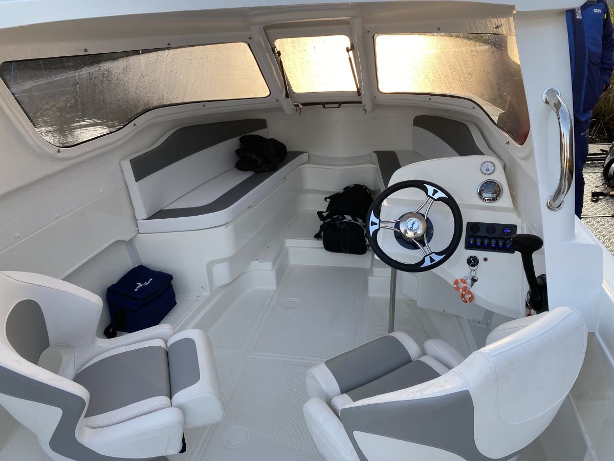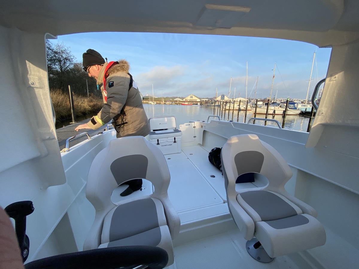 Selvdrænende, rummeligt cockpit giver ekstra sikkerhed når I er mange ombord, og båden indbyder til hyggelige ture med eller uden fiskestang ombord. Under cockpittet findes en komfortabel kahyt, og båden er som standard udstyret med 4 stangholdere, badestige samt mange muligheder for tør opbevaring.