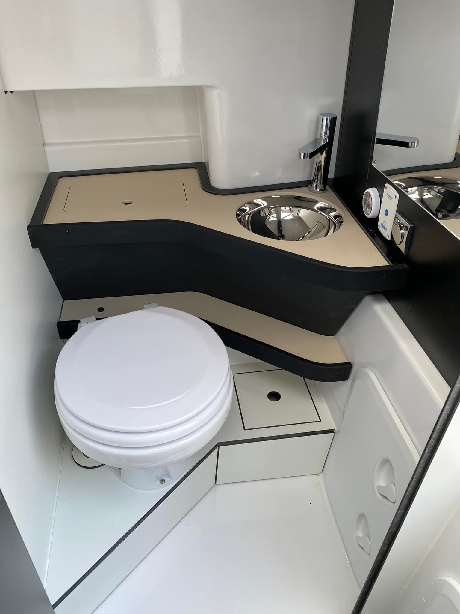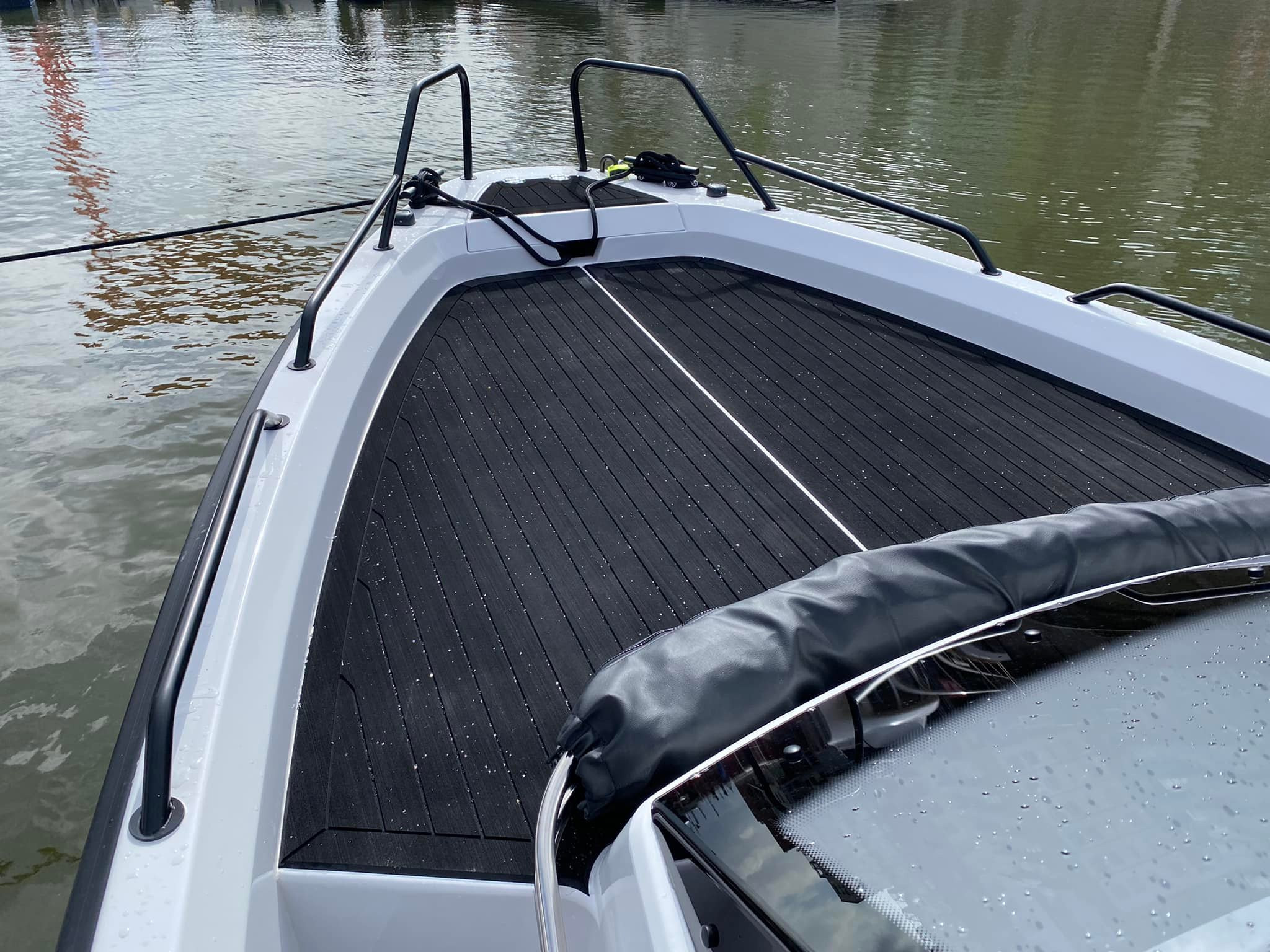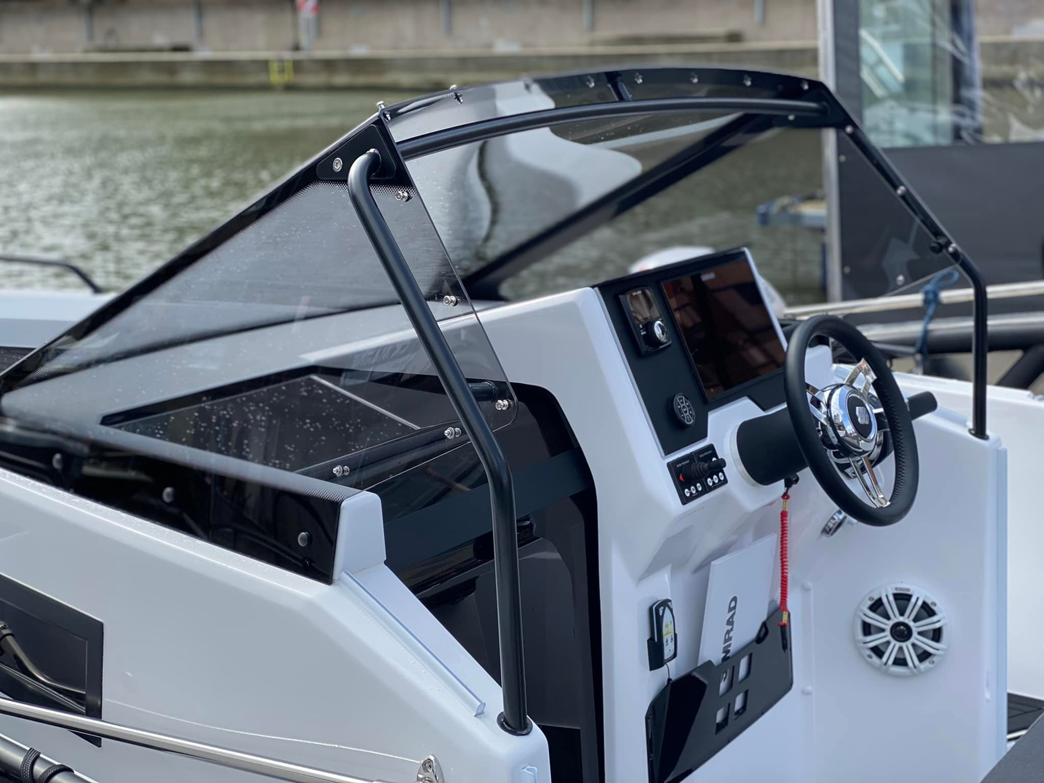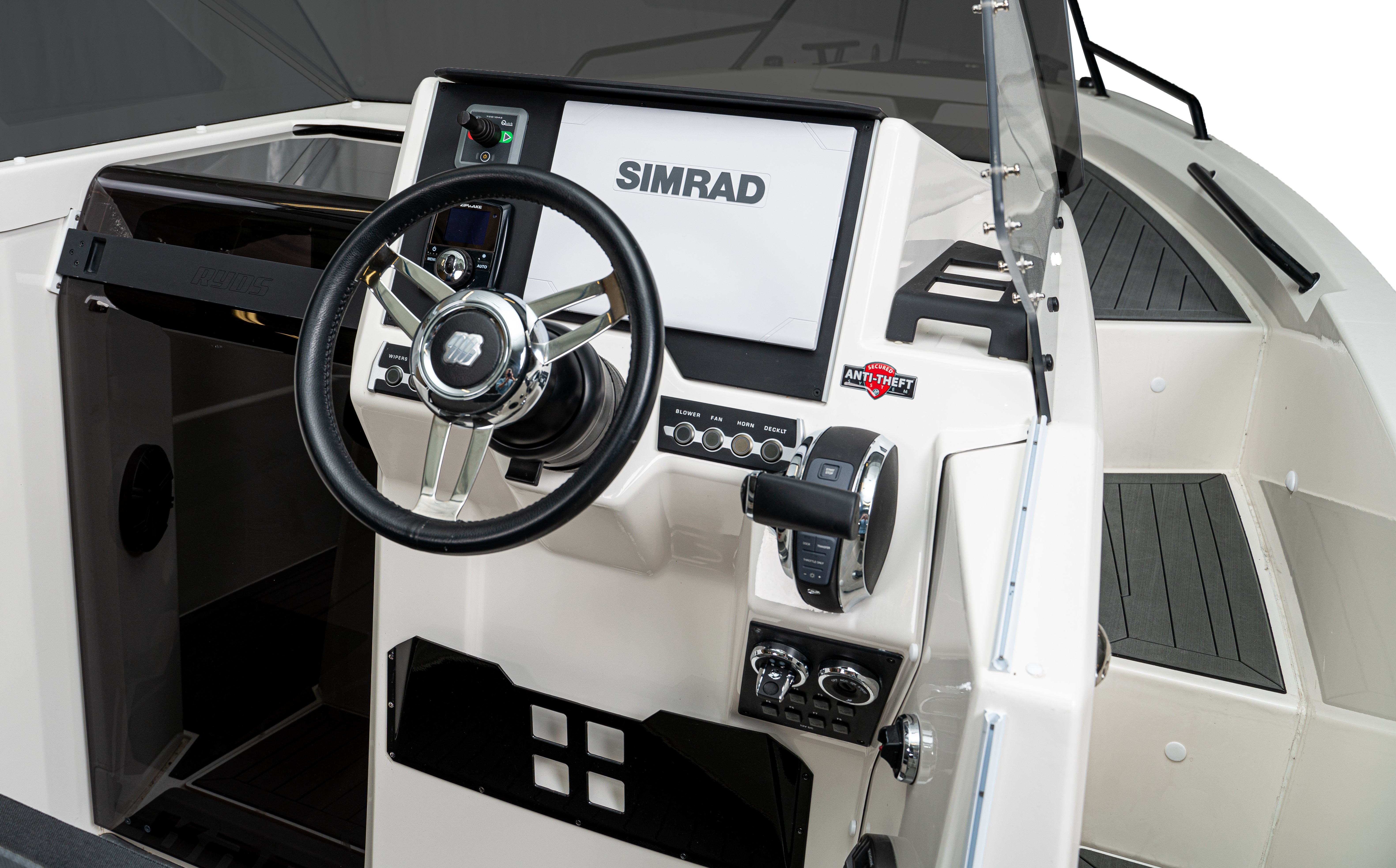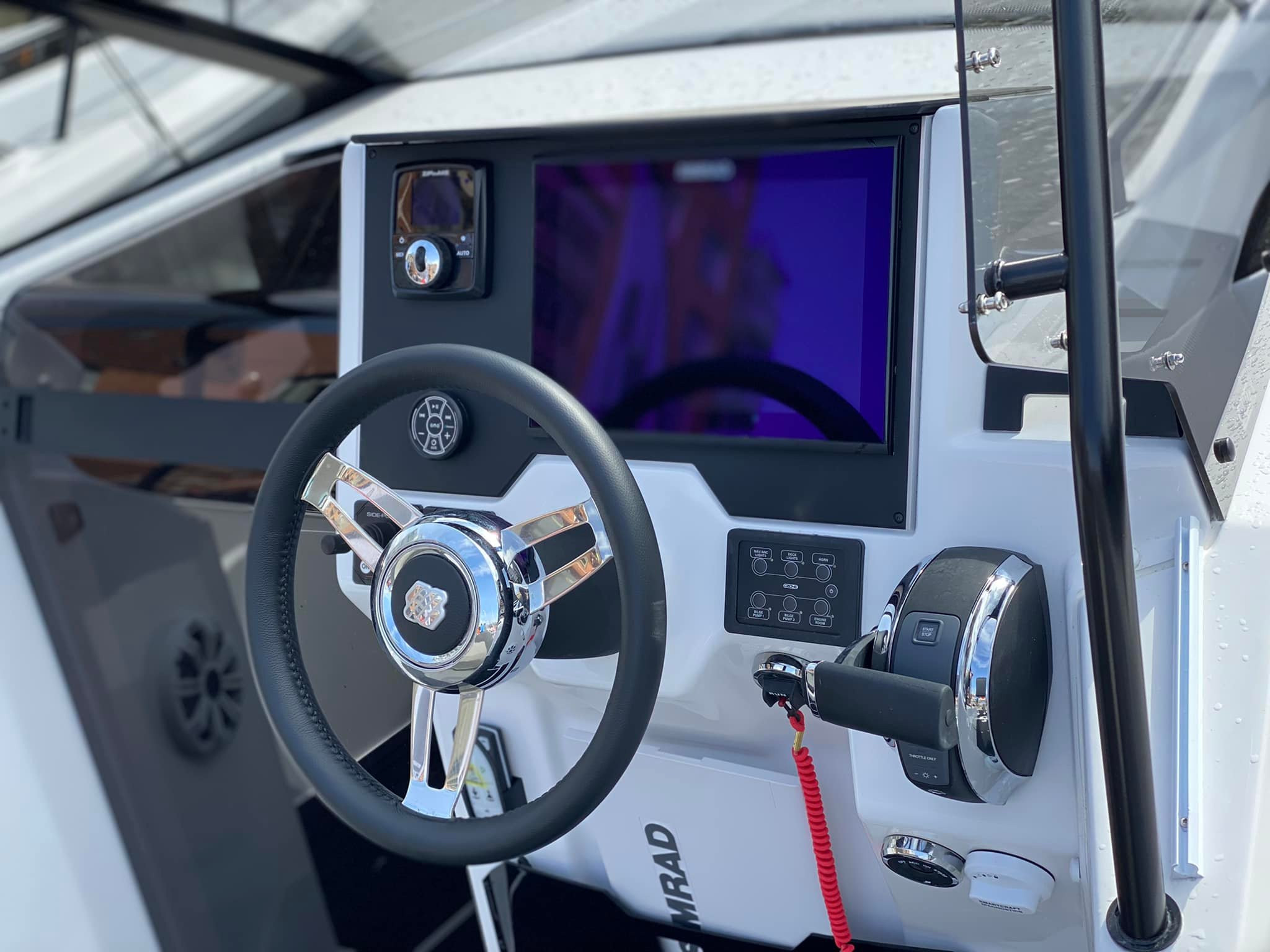 | Udstyr | Seperat toliletrum med Elektrisk søtoilet (med holding tank) og vask, EVA dørk, 250L brændstof tank, Hydraulisk styring, Køleskab 12V, LED lanterner, Solhynder til fordæk, Vandtank med ferskvands system, 3 USB udtag, diverse belysning i kabine/cockpit/toilet, Bluetooth musikanlæg med radio, Bord med kopholdere, Elektrisk lænsepumpe, Holding tank, Simrad GO9 GPS ekkolod/fishfinder med motordata instrumeter. |